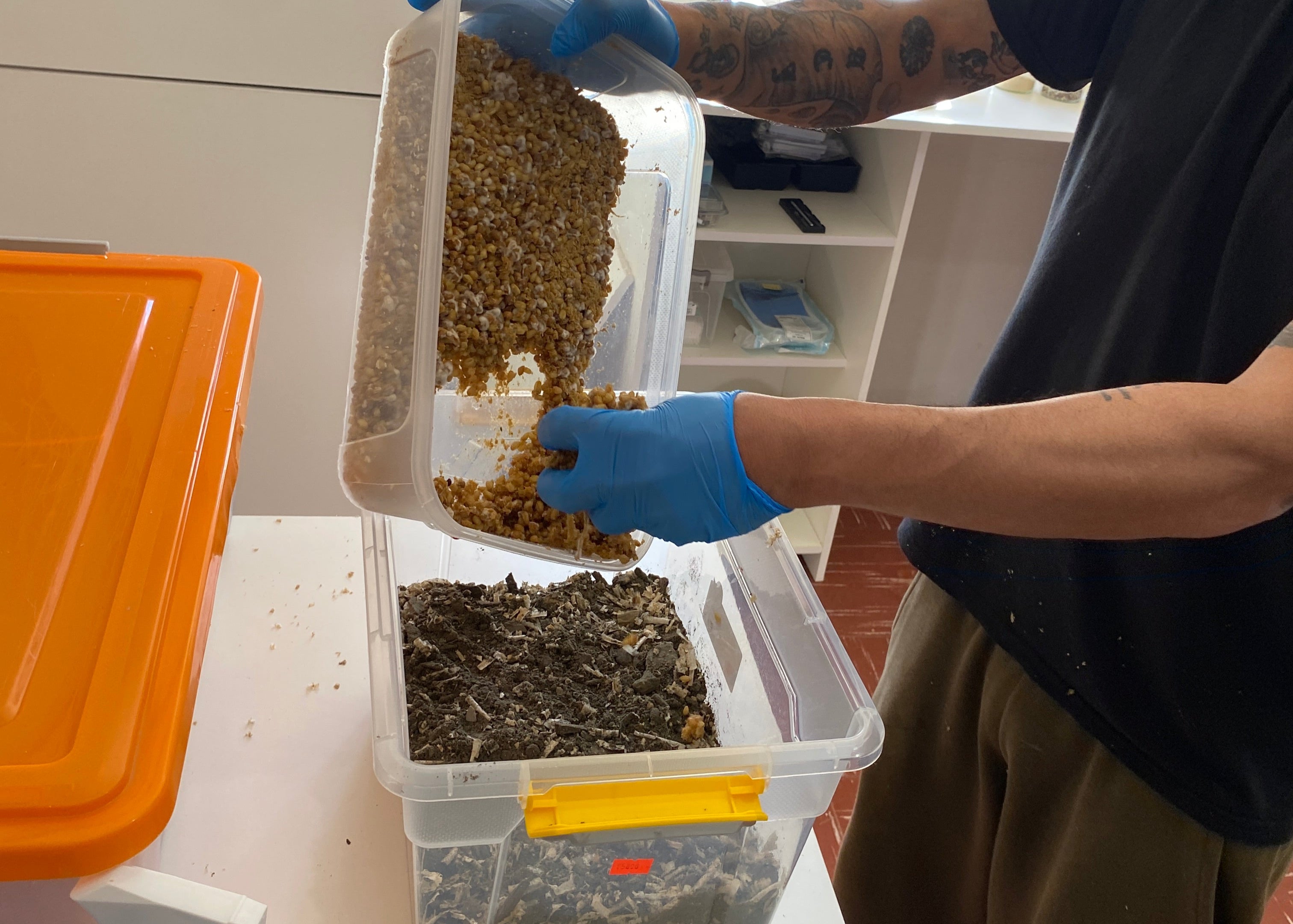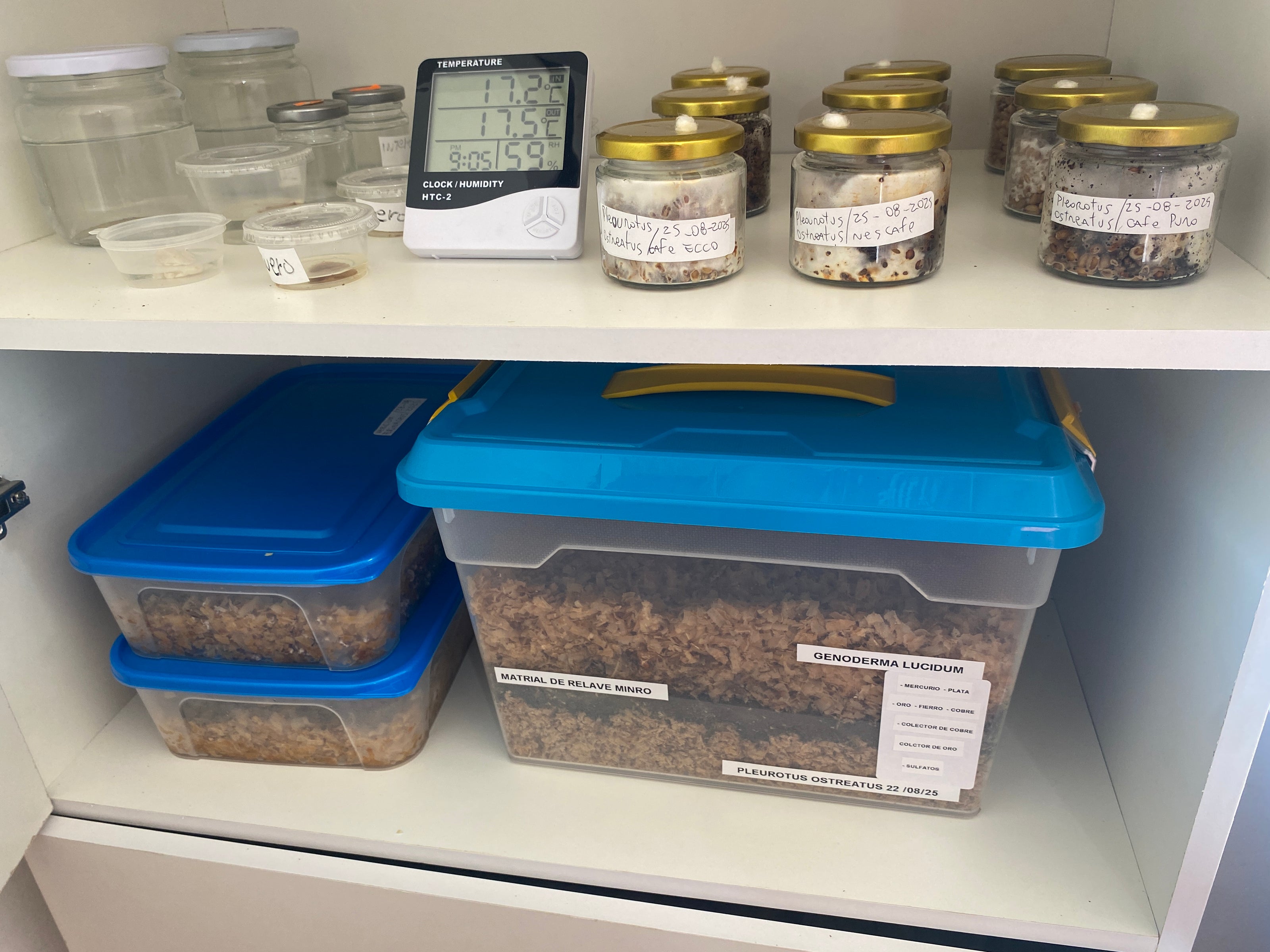 El Piloto1 de Micorremediación se conserva en condiciones cuidadosamente controladas de temperatura y humedad. Este paso es esencial para asegurar el desarrollo del micelio y mantener la actividad enzimática que permite a los hongos interactuar con los contaminantes presentes en el suelo.